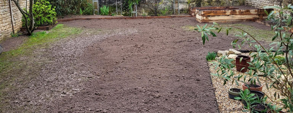 So, with their permission 10 ton of topsoil was delivered to their garage leaving our guys the unenviable task of barrowing around the corner and up into the back garden of Peter’s house – no mean feat, that’s for sure. But mob handed, the first half was completed on day one in order to allow the garage door to be closed overnight and the remainder finished later.